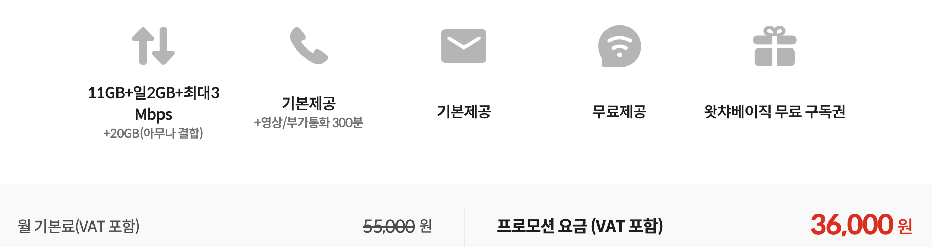 모두다 맘껏 11GB+ 요금제의 월 기본 요금은 55,000원(VAT 포함)이지만, 프로모션이 적용되면 월 36,000원으로 할인됩니다. 이 가격에는 왓챠 베이직 구독권과 기본 제공 데이터, 음성 및 문자 혜택이 포함되어 있어, 영상 콘텐츠와 데이터 사용을 모두 충족하려는 고객에게 비용 효율적입니다.